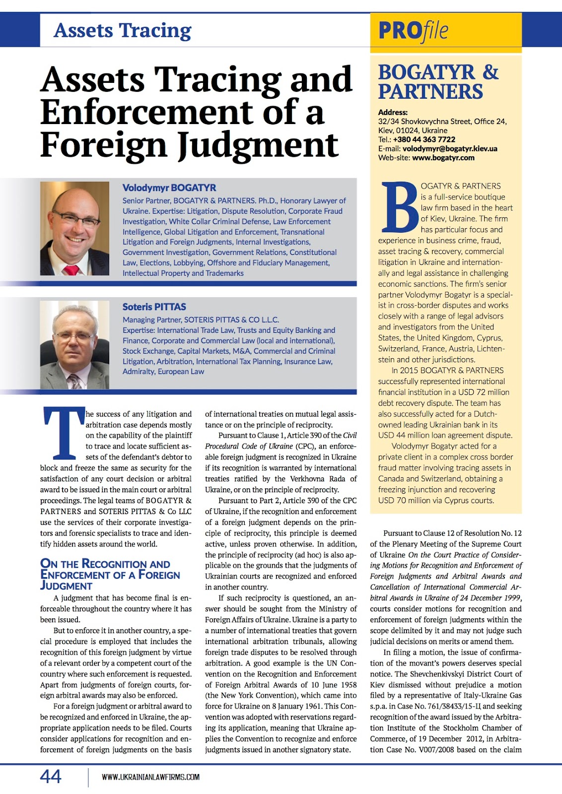 The legal teams of BOGATYR & PARTNERS and SOTERIS PITTAS & Co LLC have huge experience in carrying out forensic investigations and in handling discovery actions, for the tracing of assets of debtors or wrongdoers and collection of valuable evidence needed for the successful outcome of a court and arbitration case.
